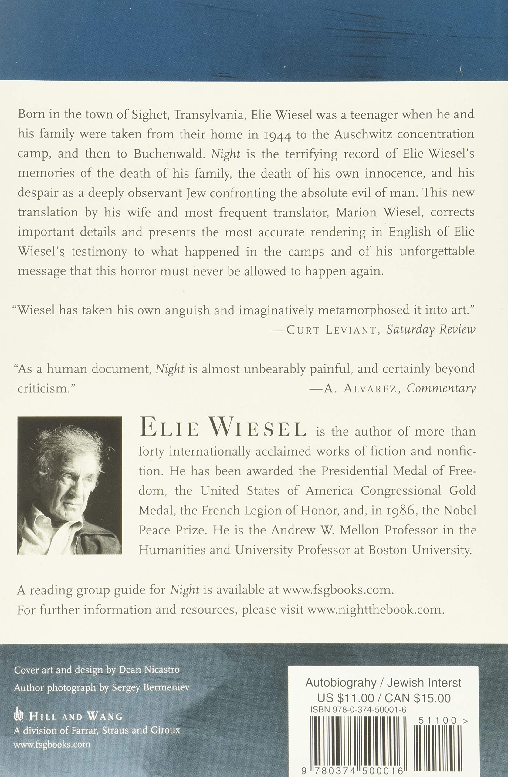 “What makes this book so chilling is not the pretense of what happened but a very real description of every thought, fear and the apathetic attitude demonstrated as a response . . . Night, Wiesel's autobiographical masterpiece, is a heartbreaking memoir. Wiesel has taken his painful memories and channeled them into an amazing document which chronicles his most intense emotions every step along the way.” ―Jose Del Real, Anchorage Daily News