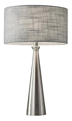 - A smooth, tapered base with a brushed steel finish beautifully reflects the light shining through a light grey textured fabric shade