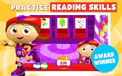APP FEATURES - 5 interactive Super Reader literacy games each with a different focus on phonics and designed to get kids to practice and strengthen their reading skills - 60 key word families needed to learn to read are featured in each game (such as the –ALL word family, with words like “ball,” “tall,” “wall”) - Reward system providing 200+ stickers that kids can earn and decorate with in the Phonics Fair Prize Booth - Parent tools, including device notifications and a progress tracker that enables parents to see how their children are performing on each of the games and which word families may need more practice