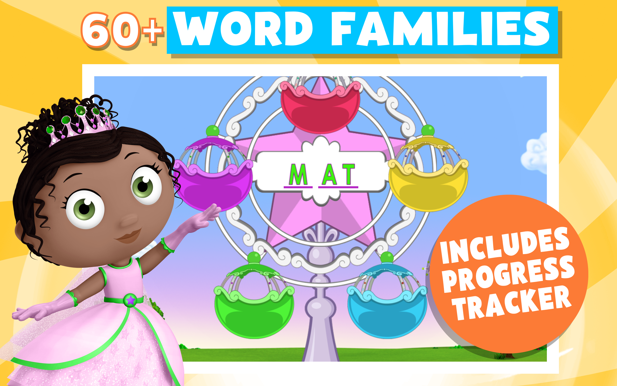 60 key word families that are needed to learn to read are featured in each game (such as the –ALL word family, with words like “ball,” “tall,” “wall”).