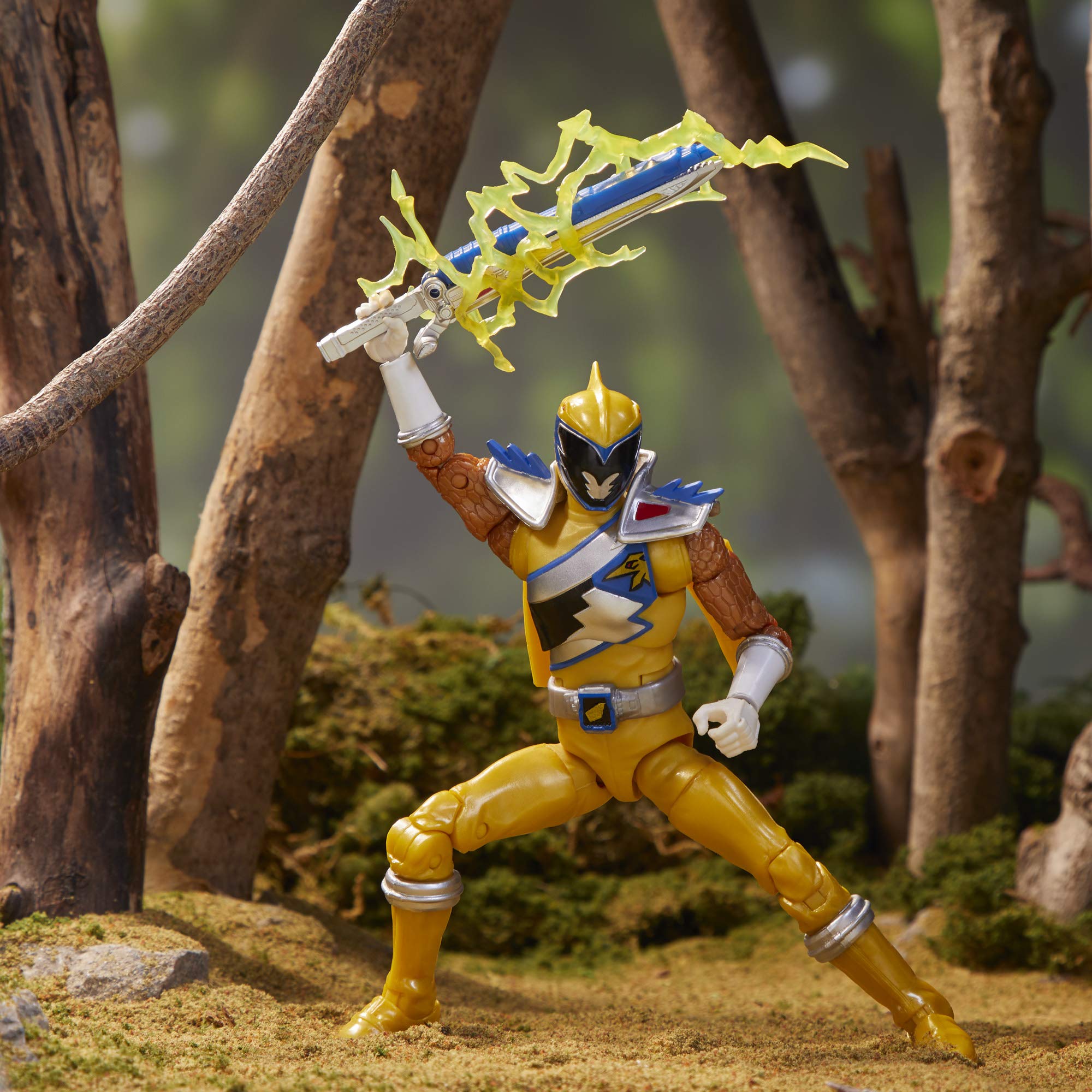 this 6-inch lightning collection Dino charge gold Ranger figure features premium paint and decorative details inspired by the show, over 20 points of articulation for high pose ability, swappable heads of the Ranger with and without his helmet, a ptera saber, blast effect piece, and an extra pair of hands for more ways to play or display. Go go Power rangers!