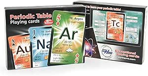 A double deck of regular playing cards with the Periodic Table Elements. Each card features one element, it has the atomic number, name of the element in English, French and Spanish, the mass, the category, melting and boiling points, period and group, natural state and common usages. A great learning aid.