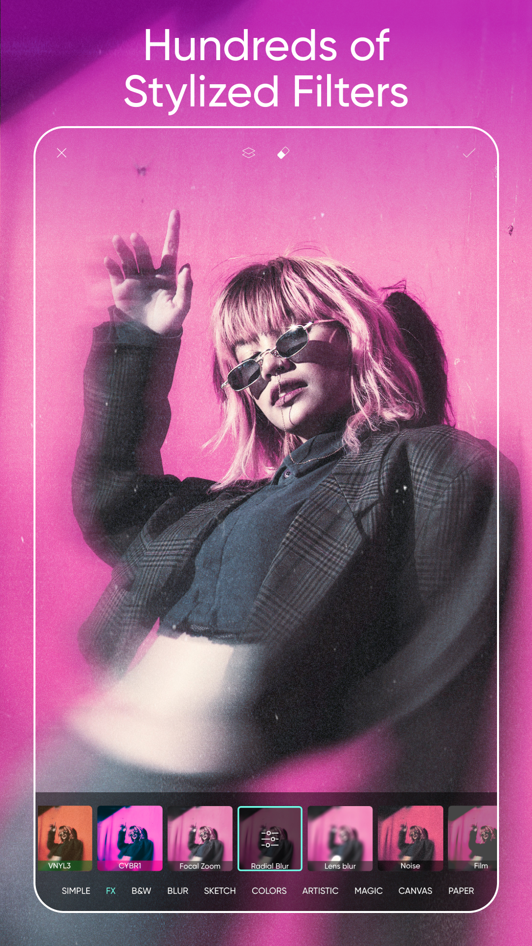 PHOTO EFFECTS & FILTERS • Outline selfies with the popular Sketch effects • Turn portraits into artistic masterpieces with Canvas effects • Make Drip Art with dripping effect stickers & customize the blend mode • Cartoon yourself in seconds with amazing Magic effects
