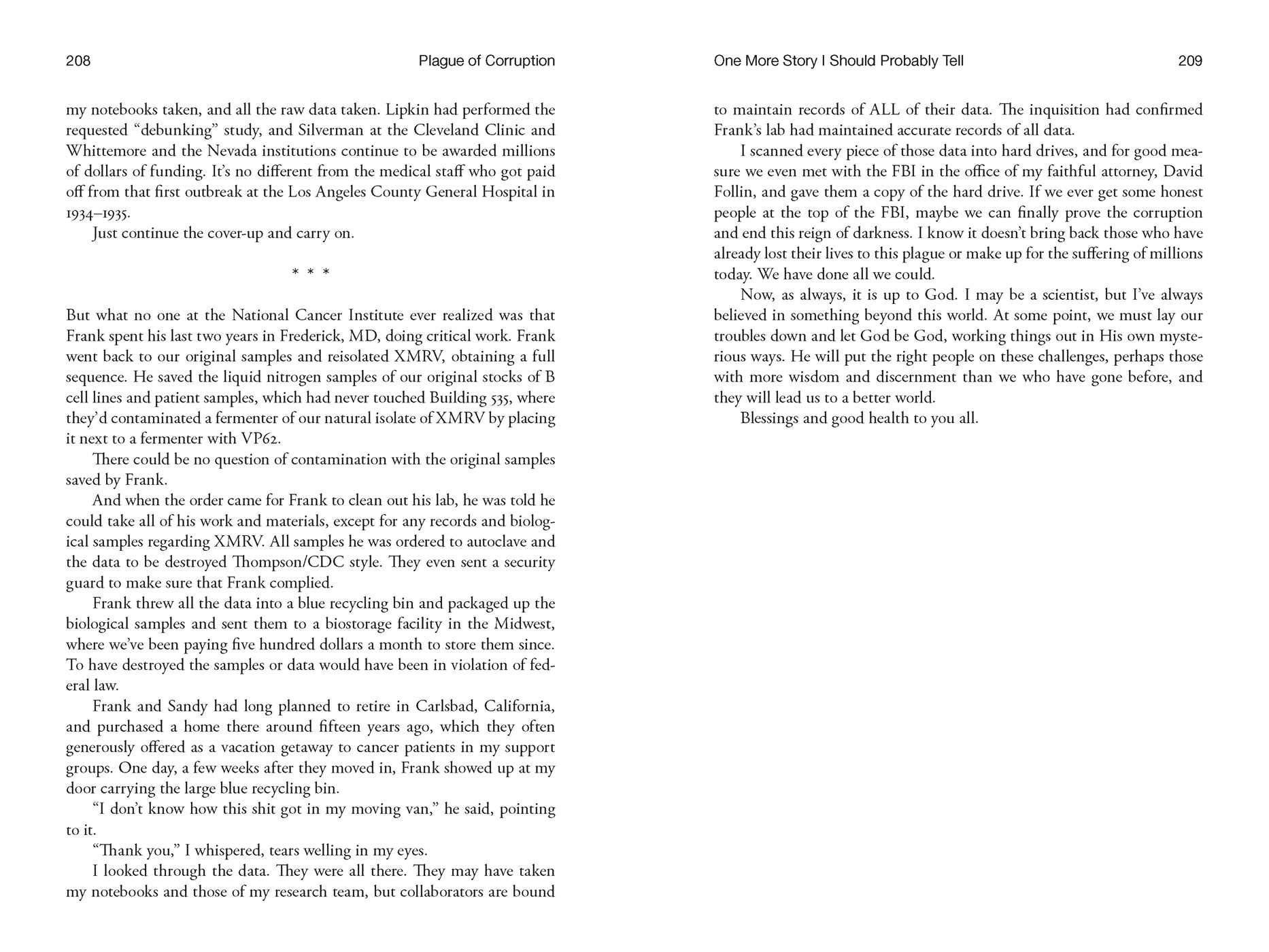 This book gives you a glimpse into the world of the institutions and characters who have been involved in making public policy. How financial and political interests are more important that the truth about what scientists like Dr Mikovits are finding. I am not as hopeful as Kent & Judy that the "faith in science" can be restored. Because the perpetrators will never come forward and admit what they did. They hold entrenched positions in government agencies and would rather burn the evidence than admit that they poisoned the human population and withheld from us out of hubris, corruption, and greed.