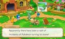 In the Pokemon Super Mystery Dungeon game, the player will be transformed into one of 20 Pokemon as they set out on an adventure in a world inhabited solely by the 720 discovered Pokemon. This game boasts hours of replay-ability as each dungeon is randomly generated, so you'll never explore the same dungeon twice as you unravel this tale of adventure and mystery. The player can choose their playable character and their partner Pokemon from a selection of 20 Pokemon. All 720 discovered Pokemon appear in this game, including Legendary and Mythical Pokemon. Mystery Dungeons are found everywhere and they change their form every time they are entered. The items and treasures will also change every time you enter. The partner Pokemon supports the player and their friendship will help to solve the mystery of why Pokemon are being turned into stone!