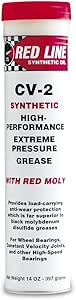 Red Line Synthetic CV-2 Grease Designed to withstand the extreme temperatures and pressures which occur in high-performance wheel bearings and CV-joints. The excellent high-temperature stability, extreme- pressure protection, and water resistance enables it to out-perform even the best conventional or synthetic greases. Red Line CV-2 Grease can be used in a wide range of applications at temperatures ranging between -100°F to 500°F and provides good oxidation and corrosion resistance, low evaporation and oil separation, and has a minimum effect on rubber seals. The exceptional extreme- pressure performance and the fluidity of the synthetic oil allows increases in bearing life of 200% to 800%. Red Line CV-2 Grease contains a red moly compound which is a superior lubricant to black moly disulfide lubricants.