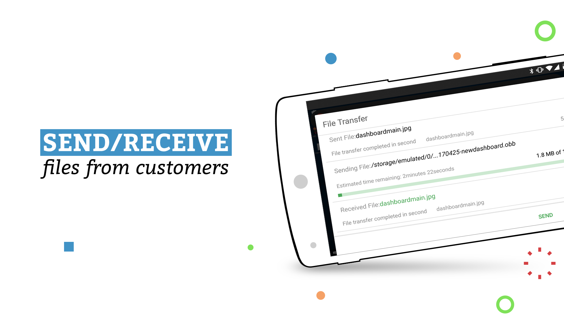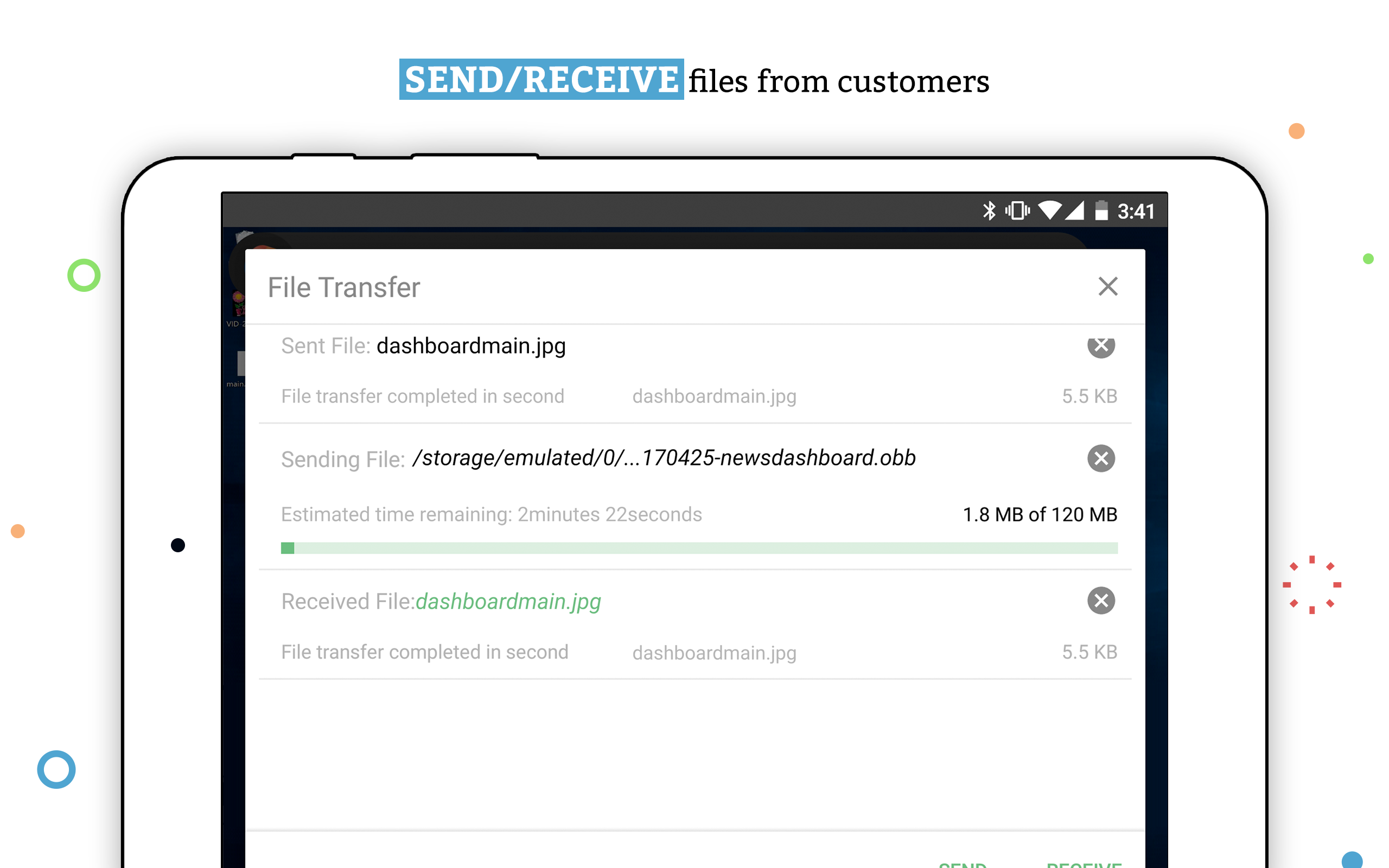 Transfer files to and from your android device. Send and receive files even to a remote unattended computer.