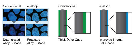 A new strong, thin outer case has also been added to the eneloop battery design in order to improve the internal cell space efficiency. The new case optimizes the balance of the components and when combined with other improvements have led to an increase in the number of times that eneloop batteries can be recharged.