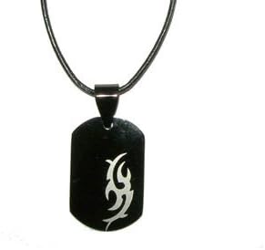 Pendant is surgical steel finished in high black gloss which has been lazer inscribed with a tribal design. You will receive a black 18" leather necklace with spring loaded clasp with the pendant. The pendant measures 1-3/4" including the bail.