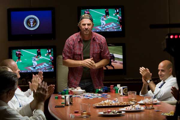 The ghost of Frank Capra is summoned up in Swing Vote, a populist comedy about the U.S. presidential election--because of an electoral deadlock--coming down to one man, one vote. Alarmingly (for the future of the world), that one man is Bud Johnson (Kevin Costner), a beer-swilling, newly-unemployed divorced dad in Texico, New Mexico. Bud's got a week to re-cast his flawed ballot, so the entire election process--including the two candidates, played by Kelsey Grammer and Dennis Hopper--descends on Texico for an orgy of campaign flapdoodle. Costner tries hard (probably too hard) to be the irresponsible good ol' boy, the kind of role he used to be able to handle with ease; by contrast, the composed Madeline Carroll, as his Little Miss Sunshiny daughter, comes off as a model of naturalism. Except for some pointed commercials, in which the candidates sell out their values to appeal to Bud's whimsical opinions on issues such as abortion and gay marriage, the movie's political bite is remarkably toothless. Both Stanley Tucci and Nathan Lane are in the groove as cutthroat campaign managers, and the movie is jolted out of its beery idle with a late one-scene performance by Mare Winningham. There's an interesting film trying to climb out of Swing Vote, but it needs Frank Capra to kick it into shape. --Robert Horton