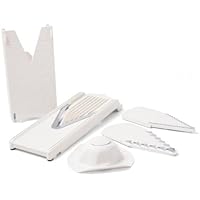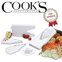An inexpensive alternative to a professional stainless-steel mandoline, this device makes it possible to quickly, uniformly, and safely slice and julienne vegetables and fruits. It also shreds cabbage and neatly dices potatoes, tomatoes, and onions. For safety, a holder firmly grips food with stainless-steel prongs so fingers are protected from the German surgical-steel blades, and the three inserts accompanying the device lock in position. The inserts act as a guide for slicing against the V-frame's knife that reverses to create slices either 1/4-inch or 1/16-inch thick and two julienne inserts for creating 1/8-inch or 3/8-inch strips. For storage, the V-frame, all three inserts, and the safety holder fit into a caddy that can stand upright on the counter, lie flat in a drawer, or hang on the wall. Made of rugged plastic, the device measures 15 inches long and 6 inches wide when assembled for storage. --Fred Brack