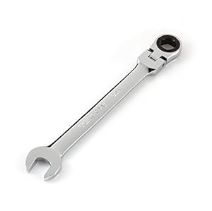 TEKTON Flex-Head Ratcheting Combination Wrenches offer the speed and ease of a ratcheting box end that stays continuously engaged with fasteners, eliminating the need to re-fit after each turn. Smoothly pivoting through 180 degrees, the box end head holds any angle to slide onto fasteners. It is free to move with each stroke, allowing the wrench to navigate around obstructions along the swing path. A 6-point opening provides a sure, snug fit on hex-shaped fasteners so you can apply maximum torque without slipping off, saving aggravation and your knuckles. To prevent round-off, the box end opening contacts and applies force to the flat sides of fastener heads rather than the corners. Equipped with a 72-tooth ratchet gear that needs just 5 degrees of swing arc to reach the next tooth position, it's fast and efficient when there's not much room to move. The open end is angled 15 degrees, allowing the wrench to be flipped over with each rotation to engage the fastener twice as often when you're working in tight spaces.