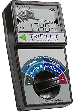 The TriField EMF Meter Model TF2 is an AC gaussmeter, AC electric field meter, and radio power density meter in a single unit, that combines all the features needed for fast, accurate measurements of electromagnetic fields (EMF). In addition to standard AC measurement modes, a special frequency weighted mode will properly scale the magnetic and electric measurements to indicate the full magnitude of currents produced by each type of field inside the human body. (If only powerline frequency is present, Standard and Weighted will read the same. If higher frequencies are present, Weighted reads higher). Made in USA by AlphaLab, Inc.