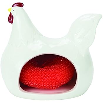 Farmhouse Hen Scrubby Holder and Non-Scratch Scrubby, Hand Painted Ceramic, By Boston Warehouse