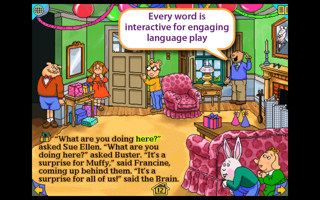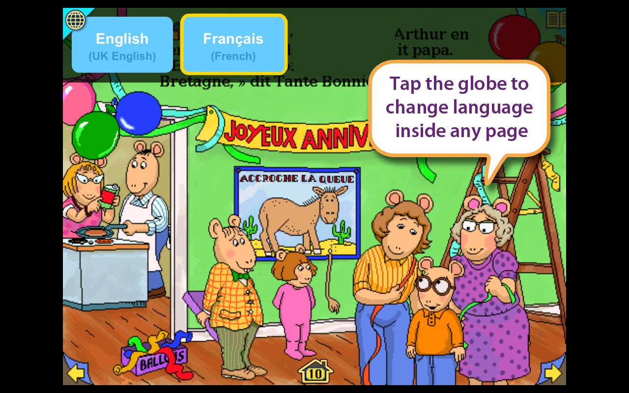 KEY FEATURES: • Interactive storybook with 13 animated pages in UK English and French • Change language from any page in the story • Virtually every item on each page comes to life when clicked • All words are "active" for extended word play and language learning – click on any word to hear it spoken • A hidden surprise is on each page –can you find all the confetti? • Two story modes: "Read to Me" and the fully interactive "Let Me Play, with multiple settings to further customize the App for your child’s reading experience • Parental tips help you get the most out of this Wanderful interactive storybook • Teacher resources include a 33 page overview of Wanderful Classroom Activities and a free preview of the Arthur’s Birthday Classroom Activities guide • The full 61 page Classroom Activities guide is also available