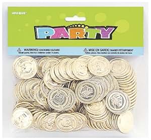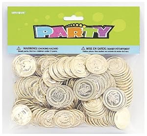 Strike gold at your next party with these Gold Pirate Coins. These Pirate Treasure Coins make great party favors as well as party decorations. Sprinkle coins on party tables or use them to fill centerpiece decorations or loot bags. Since these coins are made of plastic, they even sink, so you can use them to fill an under the water themed pirate decoration. Each bag comes with 144 plastic gold coins, so there's plenty of pirate's booty to go around.