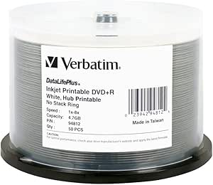 Verbatim 4.7GB up to 16x DataLifePlusWhite Inkjet PrintableHub Printable Recordable Disc DVD-R 50-Disc Spindle 95079