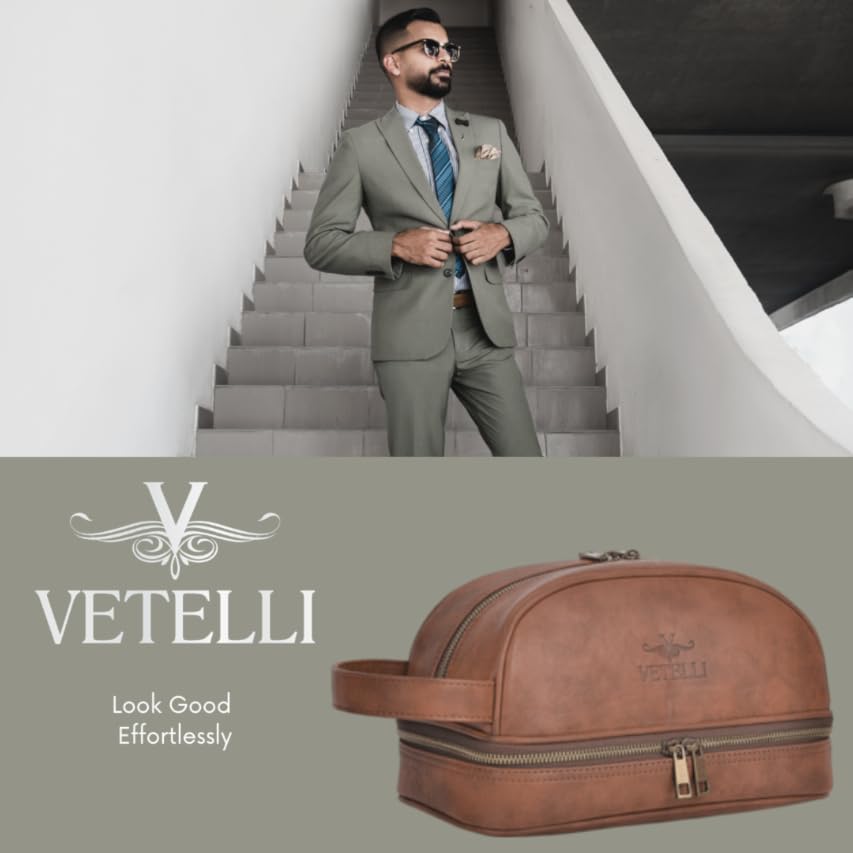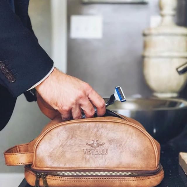 Vetell Classic Leather Men's Travel Toiletry Bag and Dopp Kit with Upper and Lower Zippered Compartments, 2 Mesh Bottle Pouches and Carrying Handle