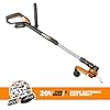 The WORX cordless 20-volt MAX lithium powered string trimmer delivers new levels of power, precision and function. Those 20 volts of MAX lithium battery power give the WG160 longer run times and more power. The 12-inch cutting diameter means more trimming in less time. Convert to an edger in seconds, with dual-positioned in-line wheels that make edging a breeze. The wheels also adjust to create a “mini-mower” for detailed trimming around landscaping or hard-to-reach areas. Make easy height adjustments to the telescopic shaft using the quick-release trigger lever. Turn the trimmer head with an easy pull and turn to lock and convert to edging in seconds. The Max lithium battery power means more battery capacity, longer runtimes, no self-discharge, no slow loss of power, less weight, more power and quicker charging times – you can expect up to 20 minutes of runtime for normal grass conditions. Charge the battery within 3 hours and it’ll be ready when you need it with no-self discharge. From function to features, the 20V WORX GT 2.0 features 100% single-line feed which means no bumping to extend the line. An adjustable space guard not only helps protect vegetation, it also acts as an edger guide. A front auxiliary handle has 7 locking adjustments for maximum comfort while trimming, edging, or mowing. Weighing in at less than 6 lbs., the GT 2.0 20V trimmer, edger and mini-mower lets you create a professional-looking yard with less work, less fatigue and in less time. The head tilts a full 90° to let you quickly and easily trim in those hard-to-reach places, while being fully supported by wheels