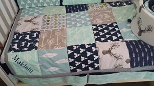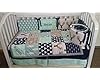***FREE SHIPPING ON U.S ORDERS**** Woodland Theme- Deer fawn, arrows, teepee, trees, feathers and other wood theme fabrics! Msg me to let me know what fabrics you like and don't for your custom crib set. THE COLORS FEATURED IN THIS SET ARE NAVY, GREY, MINT, LT BLUE, TAN, AND A SMALL AMOUNT OF HONEY. We will make to match what you want. Many different colors available in some of the fabrics. You choose whether you want all three pieces of the set or select the ones you do want. Patchwork quilt approx. 32"x44, bumper and dust ruffle. You choose your accent color. All made to order. Name embroidered on the quilt is included. If you need the name embroidered on the bumper, it will be ***FREE ****, please msg me before checking out if you need additional names. Crib sets are all cotton. Not all crib sets are made just a like. Some fonts for the name may be different, I adjust the font according to how the name looks in the font. I always try to make each set unique and individual per order. ***All of our bumpers are one solid piece , 10" high and 1" thick foam, and have ties at he top and the bottom for extra security. Our bumpers meet Nation Pediatric Association SAFETY standards. Please do your research before you buy the rounded individual piece bumpers.****