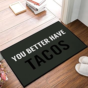 Taco Lovers understand why this makes the perfect doormat! For front entrances, bathrooms, kitchen sinks, apartments, dorms, all season rooms and more! Approximate Size: 2x3 Color: Black Background - White Text Indoor Only - Low Traffic Vibrant Colors - Nylon Material with Surged black edging Please Note: Sizes are approximate: Floor mats will measure slightly smaller in size due to the natural curing process after manufacturing.