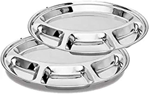 Starnk Set of 2 Stainless Steel 3 Compartment Oval Plate / Thali, Mess Tray for Kids & Dinner, Lunch