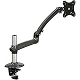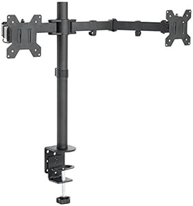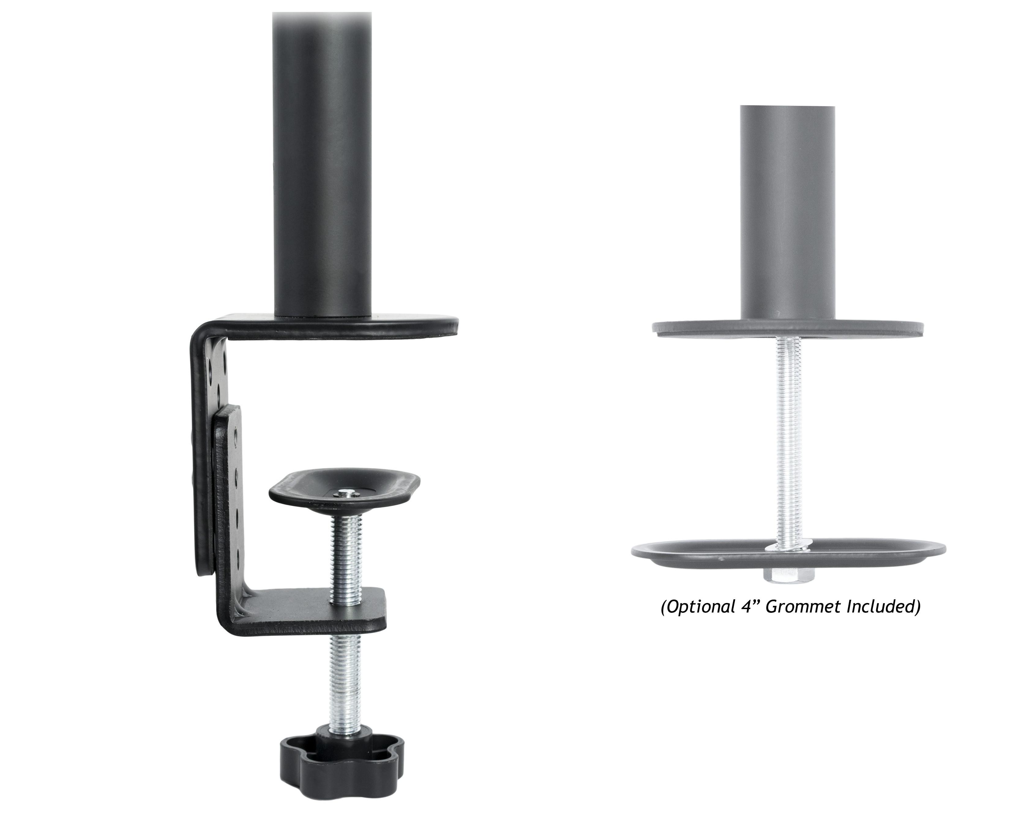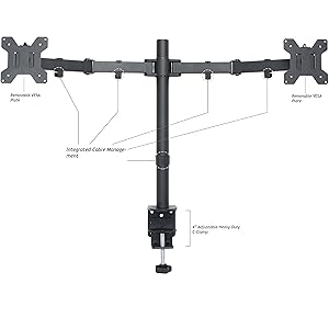 New dual monitor desk mount (model STAND-V002) made of high grade steel and aluminum from VIVO. Fits most LCD monitors 13" to 27" and supports up to 22 lbs per monitor. Every joint is able to be tightened, so you can adjust exactly how fluid/stationary you want everything to be. Special features include the ability for each individual VESA plate to be adjusted up and down by .5" so your monitors will be perfectly aligned (see pictures and video for more information). We also made mounting your monitors easy with detachable VESA plates that screw into your monitors and then slide back onto the frame of the stand. Heavy duty 4" C-clamp and 4" grommet mounting options are included. This has standard VESA 75x75mm and 100x100mm mounting holes. Recently upgraded design with added features such as removable VESA plates and more Features: - Tilt: -15 to +15 degree - Swivel: 360 degree - Rotate: 360 degree - Height adjustable - Ultra heavy duty "C" clamp - Integrated cable management system - Monitor can be installed either in portrait or landscape shape - Fully adjustable arms - Vesa Standard: VESA 75 (hole pattern: 75 x 75 mm), VESA 100 (hole pattern: 100 x 100 mm) - Center Post is 18" tall and the mounting brackets are exactly 29" on center (apart), please see product diagram for further details.