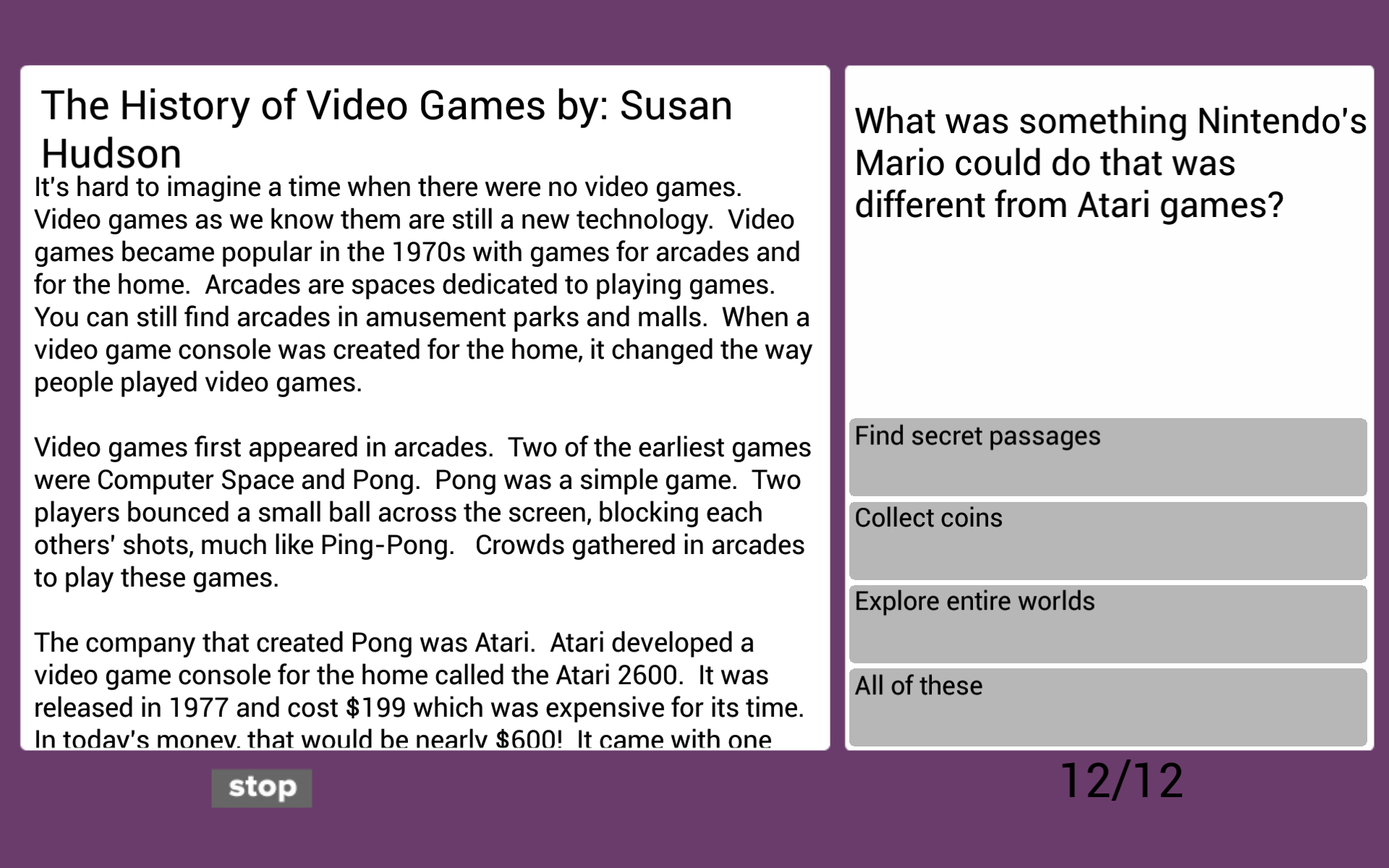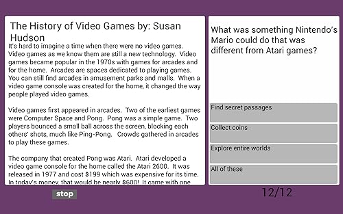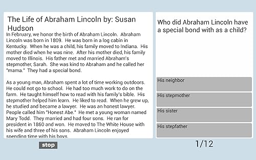 Our Ultimate Reading Comprehension series was designed for students looking for an advantage in solidifying their reading and understanding skills: * FREE! A collection of 12 original stories written specifically for this app * Choose between fiction, non-fiction, or a mix of both fiction and non-fiction selections * Read and test your comprehension with a variety of questions about the selected passages * Study anywhere and learn at your own pace * Each passage and question set takes approximately 5-8 minutes to complete * Specifically appropriate content chosen at the 3rd, 4th, and 5th grade levels * Works well in classrooms for independent study time * Email student test results to share their progress * Increase student reading comprehension and their scores!