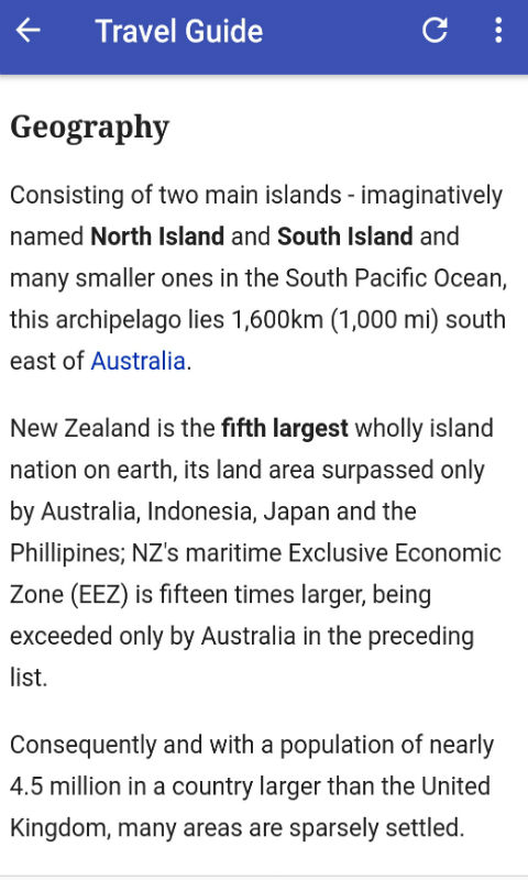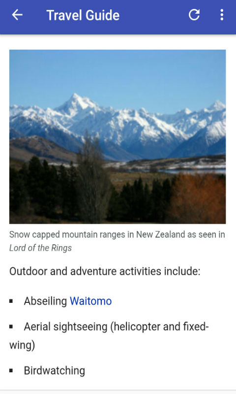Free New Zealand Travel Guide Android Application. A Complete Travel Guide for New Zealand, it contains: How to get in, Top places to see. It also contains a Hotels Search Engine to search and Book instantly the Hotel you want in New Zealand. You need internet connection to use this App.
