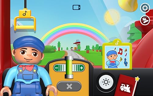 All aboard the DUPLO train! Join the train driver in an exciting adventure on the DUPLO railway. Help the driver by controlling the train’s speed, turning on the headlights, sounding the horn and more!