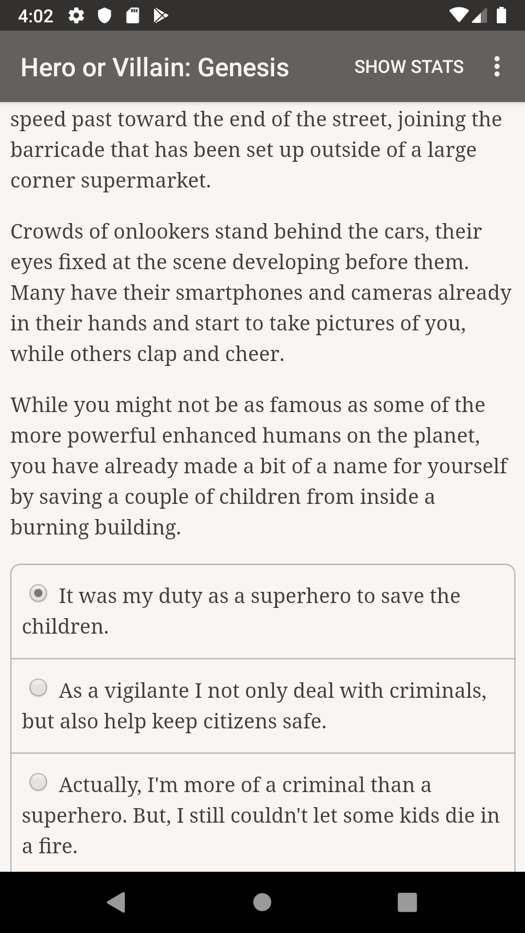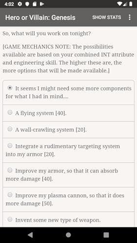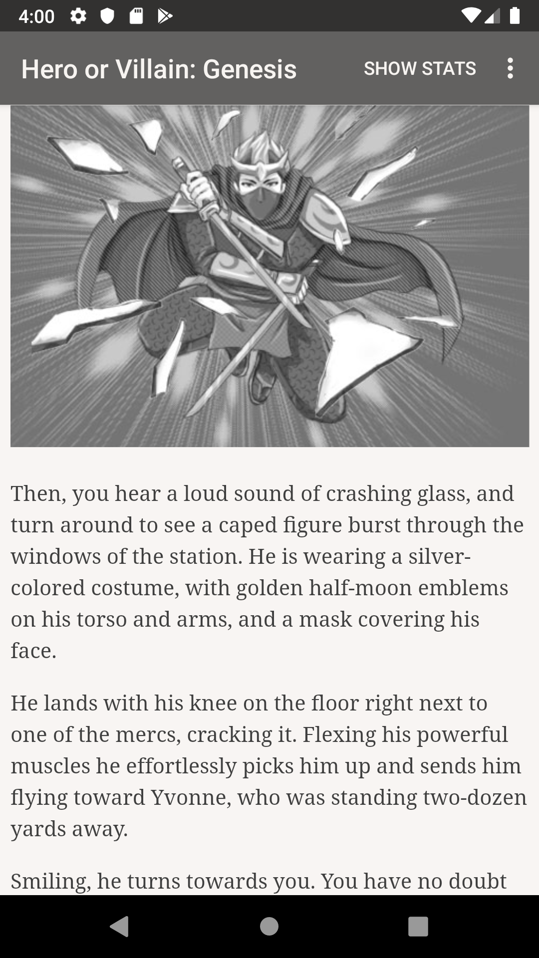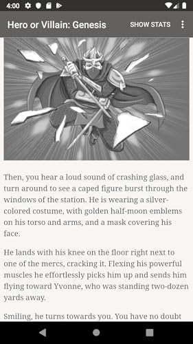 Hero or Villain: Genesis is a 330,000 word interactive novel by Adrao, where your choices control the story. The game is text-based, and while it has some artwork in it, your choices control entirely the outcome of the game. Will you hunt down villains to the last corner of the planet, join a group of fellow heroes (or villains!), defeat New York's criminal mastermind, or even replace him?