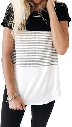 YunJey Short Sleeve Round Neck Triple Color Block Stripe T-Shirt Casual Blouse