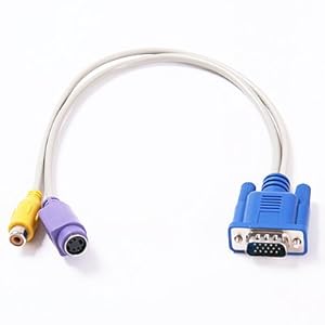Item Description Description: This converter is guaranteed to produce a color picture!!! You can use this converter with your Computers, Laptops to TVs and Projectors. Specification: * 5-inch cable length * Standard Sub-D VGA Input * RCA TV-output and 4-pin S-video output cable. * Molded strain relief at both ends * This cable has a VGA connector on one end and both RCA Jack Video (TV) Out and S-Video Out connectors on the other end. * It will work with laptops and desktops with VGA cards that has TV-Out function capability through the VGA connector. * Please, check your PC & Video Card manual or manufacturer to make sure that your VGA card has TV-Out function capability through the VGA connector to ensure this cable will work for you! * Connector: D-Sub High Density 15 pin Male to S-Video Mini Din 4 pin Female and RCA * Jack Cable: UL 2919 Coaxial Low Voltage Computer Cable. Product Details Publisher: Generic Product Group: CE Manufacturer: Generic Brand: Generic Features: Please, check your PC & Video Card manual or manufacturer to make sure that your VGA card has TV-Out function capability through the VGA connector Note:the adapter work with above G400 and NV6 serires graphic card which have TV out function Connector: D-Sub High Density 15 pin Male to S-Video Mini Din 4 pin Female and RCA ack Cable: UL 2919 Coaxial Low Voltage Computer Cable. Molded strain relief at both ends,5-inch cable length; Standard Sub-D VGA Input; RCA TV-output and 4-pin S-video output cable. List Price: $9.99 UPC: 837654140628 ASIN: B000S675JU