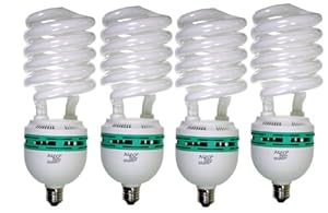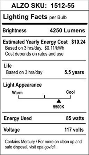 Case of four (4) 85W full spectrum light bulbs that create daylight balanced lighting, are energy saving, and have a long life of circa 6,000 hours with 4250 Lumens output, 120V; low energy consumption, used for starting plant growth. These are compact fluorescent light (CFL) bulbs. Fits all medium-base E27/E26 sockets. Dimensions: Length: 10.5 inches; Diameter: 3.9 inches; Length socket base to top of ballast: 4.5 inches; Diameter of socket: 1 inch. Important: ALZO CFL bulb life is based on the bulb in an open air upright orientation. When bulbs are installed in fixtures that lack adequate ventilation, the life of the bulb will be reduced. If an ALZO CFL bulb is installed in an overhead recessed light fixture with the bulb glass below the base, the life of the bulb will be greatly reduced.