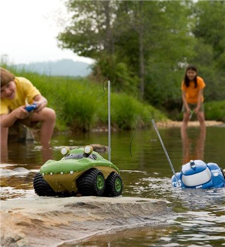 It's a "Killer Whale" of a good time driving this RC amphibious famous creature of the sea. With it's 4 x 4 high power, drive over rocks and dirt on land and then "morph" onto water. Watch the wake forming treaded paddles style wheels pull your Morphibian on water and then steer your water friend back onto land for exciting duel play fun! Full function and remote control. For Ages 5+.