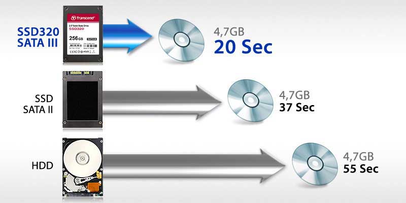 Transcend’s SSD320 is significantly faster than any hard drive. With an enormous speed advantage, a 4.7 GB DVD file can be transferred in only 20 seconds. The SSD 320 is twice as fast as a SATA II SSD and nearly three times as fast as a traditional hard drive. Increase your productivity with the SSD320 and enjoy more free time.