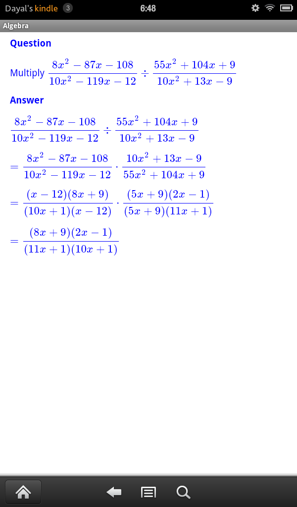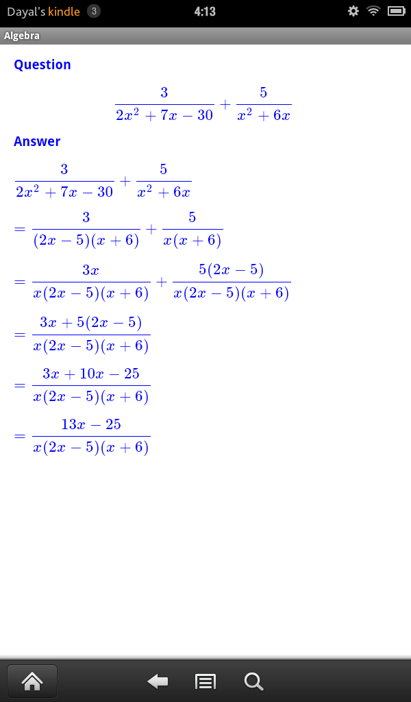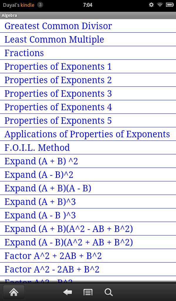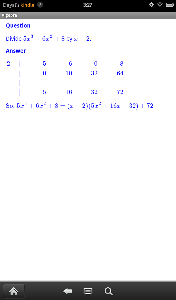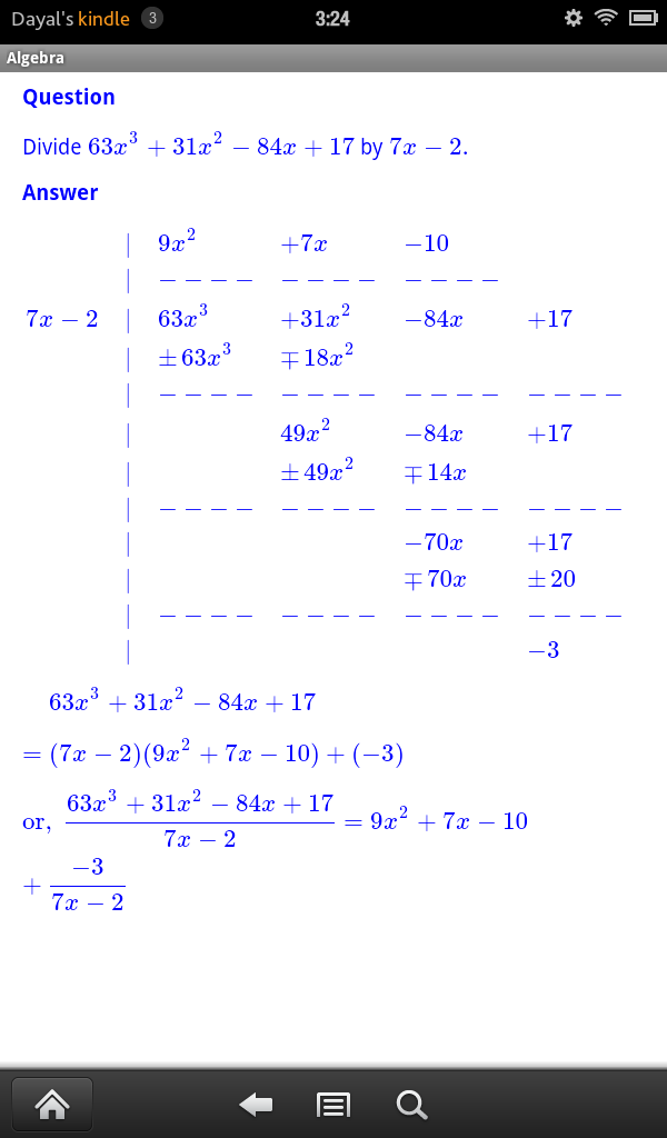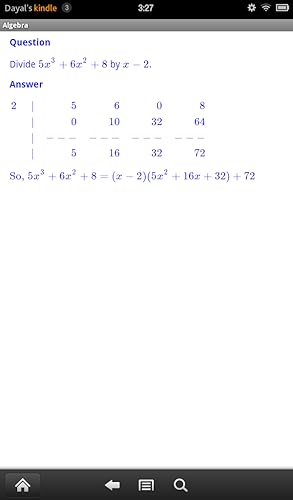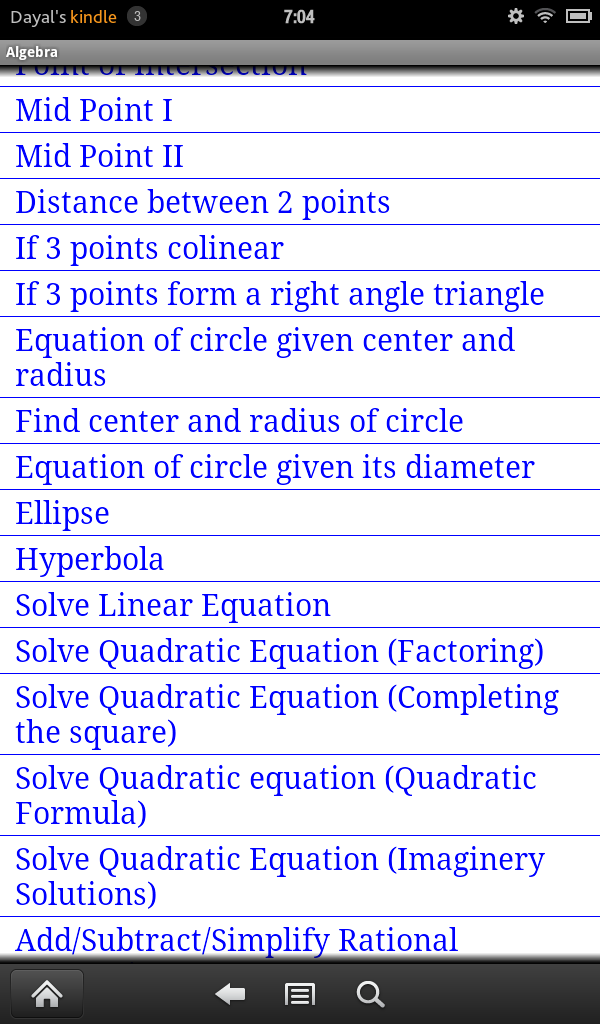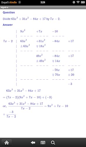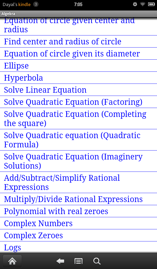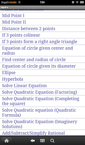 JDS Algebra consists of more than 100 routines each of which displays unlimited number of completely worked out examples from a given specific topic usually found in Elementary Algebra or Advanced Algebra or College Algebra Course. It covers topics like Unique Prime Factorization of Integers, Addition, Subtraction of Fractions, Laws of Exponents, Special Products Rule, Addition, Subtraction, Multiplication and Division of Polynomial and Rational Expressions, Factoring of Polynomials, Solutions of Polynomial Equations, Distance Formula, Mid Point Formula, Equation of Lines, Parabolas, Circles, Ellipses and Hyperbola, Addition, Subtraction, Multiplication and Division of Complex Numbers, Exponential and Logarithms, Solutions of Exponential and Logarithimic Equations.