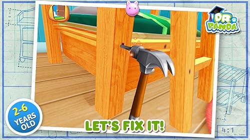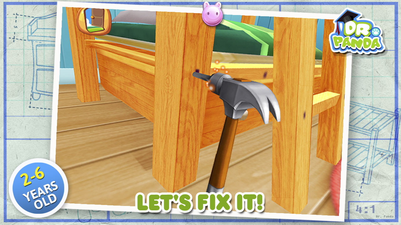 Now for a few complaints. All of my complaints are of a technical/programming nature. My daughter is playing this game on an HP Touchpad running Android ICS. First, after certain mini-games Dr. Panda will hold his hand up for a high-five, except during certain mini-games he will flicker during his animation and be invisible while expecting a high-five. The game will not progress until you tap his hand, you have to tap where his hand should be and the game continues, however some children might not be able to figure out that they need to high-five a Dr. Panda that they can not see. Second issue is the broken door mini-game. When we first downloaded the game, the door fixing mini-game would bot show any of the rest of the house whenever the hammer hit the door, everything except for the door and the hammer would turn a dark navy blue for a second while the animation of the piece of door falling would play. However during our second time loading the game, and every time since, as soon as the hammer is about to hit the door the game crashes and closes. I have tried force stopping the app and even rebooting my device, but no matter what we can no longer play that mini-game, so now we have to simply skip the house with the broken door and leaky shower. The only thing I haven't tried is uninstalling and re-installing the app, but my daughter doesn't want to lose her collected stickers. So for the time being we'll have to skip fixing that house.
