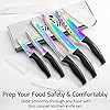- FOOD GRADE STAINLESS STEEL: Experience exceptional durability and performance with our food grade stainless steel knives. Crafted from superior quality stainless steel, each blade is finely sharpened and plated with non-stick titanium for a colorful, iridescent finish that adds a touch of style to your kitchen. This knife set includes a 20.3cm/8" Chef knife, 20.3cm/8" Bread knife, 17.75cm/7" Santoku knife, 12.7cm/5" Utility knife and 8.9cm/3.5" Paring knife
