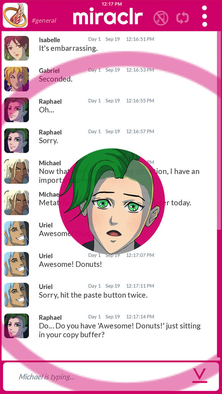 The writers did their homework. That part is obvious. I could nitpick a bit on how they wrote Raphael (and, seriously, what's with the hair?!), but for the most part, the characterizations are fairly close to what you might expect: even Gabriel's veritable "It's Pat" act isn't entirely unsupported.