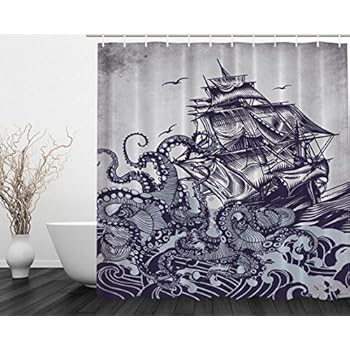 Ambesonne Kraken Shower Curtain Sail Boat Waves and Octopus Old Look Home Textile European Style Bathroom Decoration Decor Peculiar Design Hand Drawing Effect Fabric Shower Curtains (Blue)