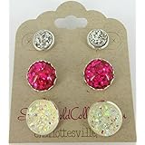 Trio Silver-Tone Stud Earrings Faux Druzy Stone Silver Clear AB Hot Pink Glitter Resin