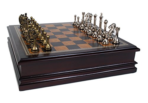 This Metal Chess Set is made with Deluxe Wood and professional craftsmanship, If you are like me and enjoy playing hours of chess with your family and friends then this is a great board, the pieces are kept within the set making it easy for storage. Pieces are designed of metal and are very durable and will last for a long time. This is a excellent board for people just learning chess as I taught my niece on it and for more dedicated players like myself it makes for excellent use! I Highly Recommend this Board! If you are considering it, stop considering and just buy it, you wont regret it!(344) -