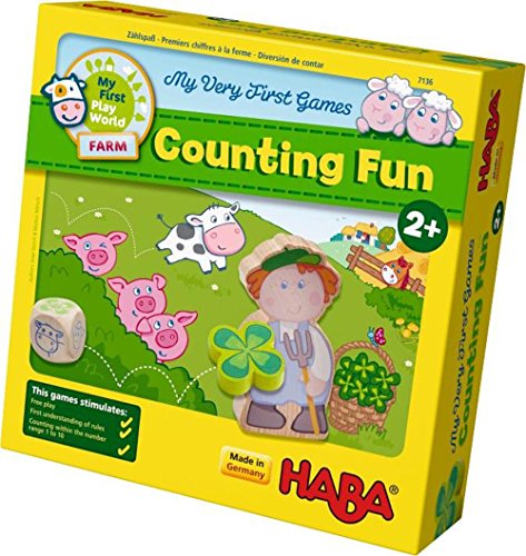 WOW! Haba really knows how to do board games for little 2-year-old toddlers. This game practices counting, animal names, and following instructions. The game is very motivating because kids want to feed the animals. I play the game cooperatively - so everyone takes turns to count the animals then move the farmer around the board. If the farmer lands on a clover, then you get to feed some animals. Kids love the idea of feeding the animals. Once all the clovers are gone, the animals are all fed, and the game is done. I could see doing a version where the animals that are fed are taken off the board... also adjusting how many clover everyone starts with, etc. Instructions also spell out how to play the game competitively. Overall, extremely pleased with the quality and game play.(4) -